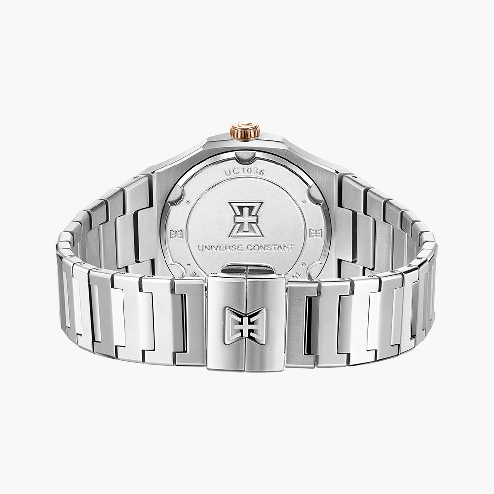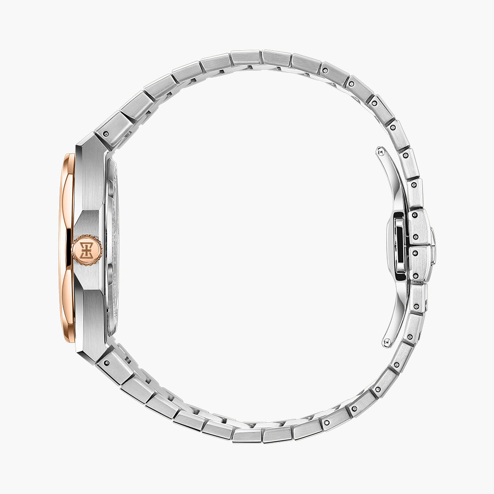 Stainless steel case, quartz movement, mother of pearl dial, integrated bracelet, certified diamond index .