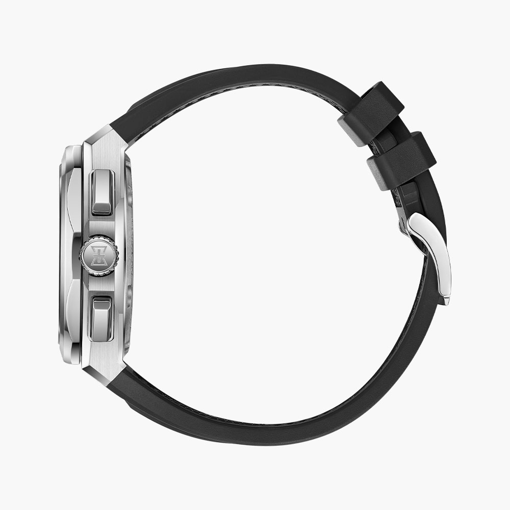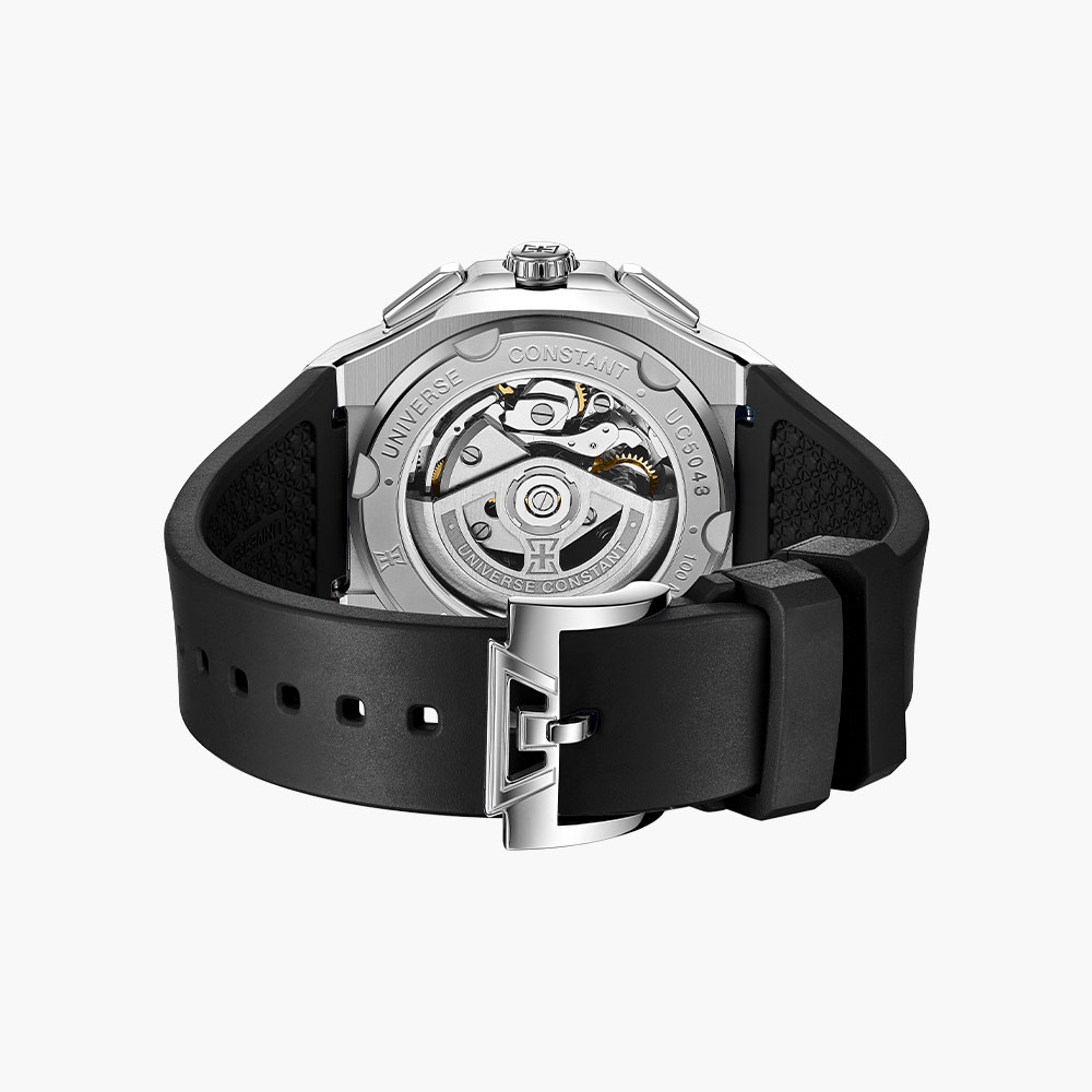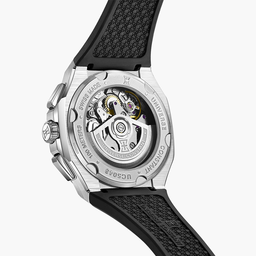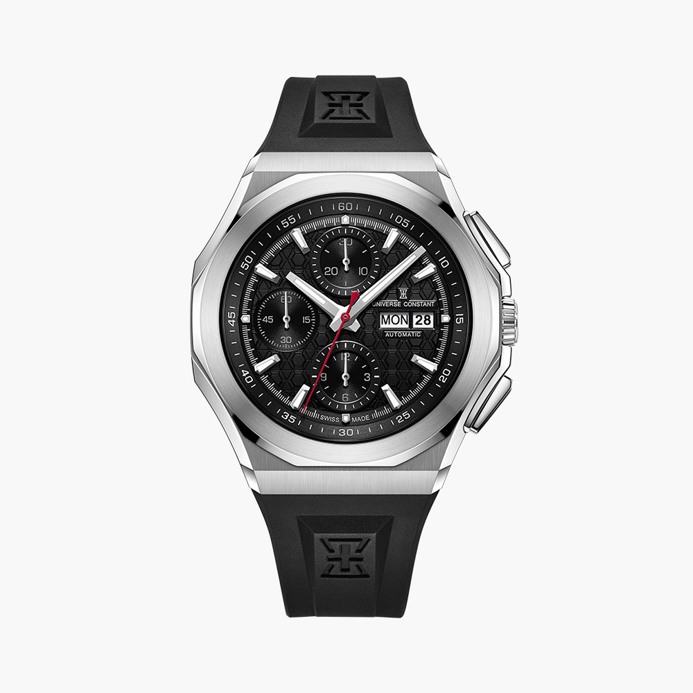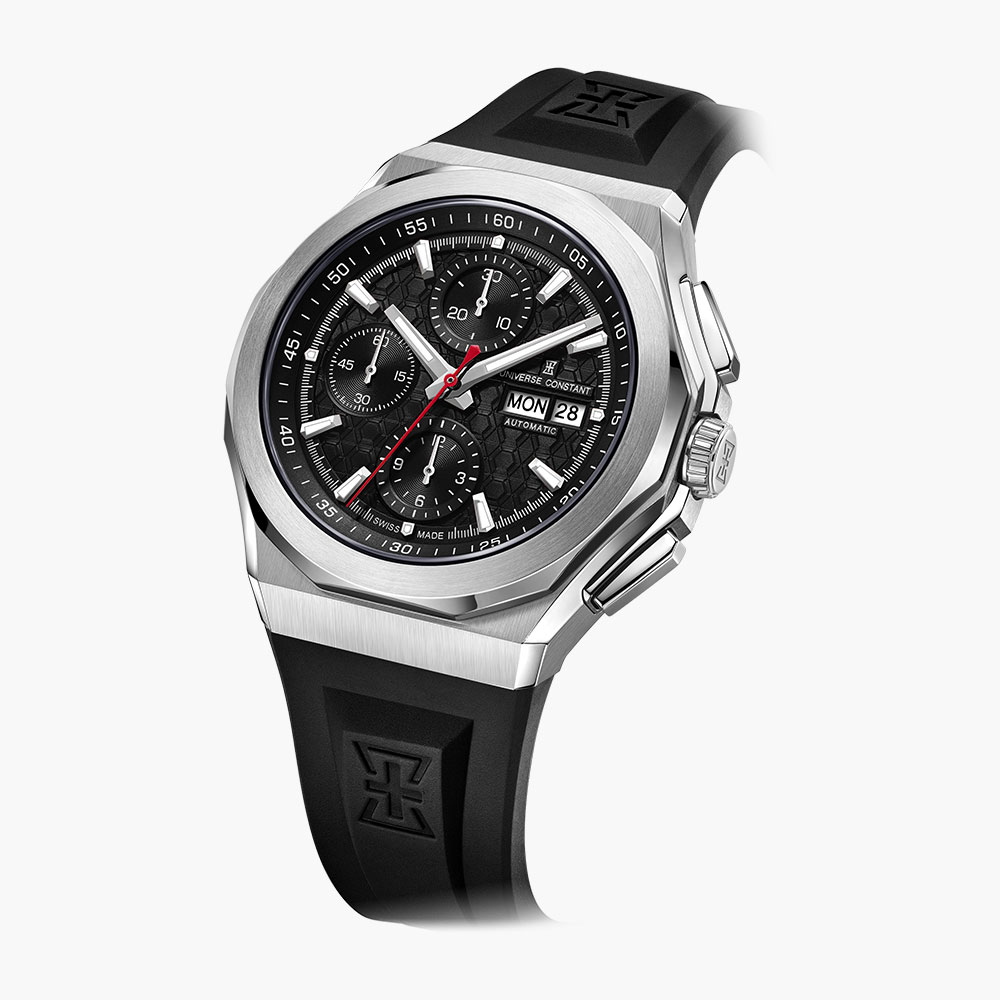 Stainless steel case, automatic movement, chronograph, day&date indicator, black dial, integrated bracelet, octagon patterned dial