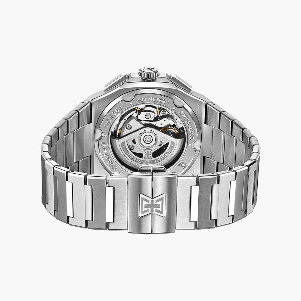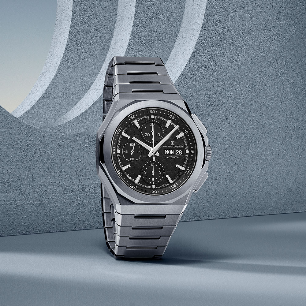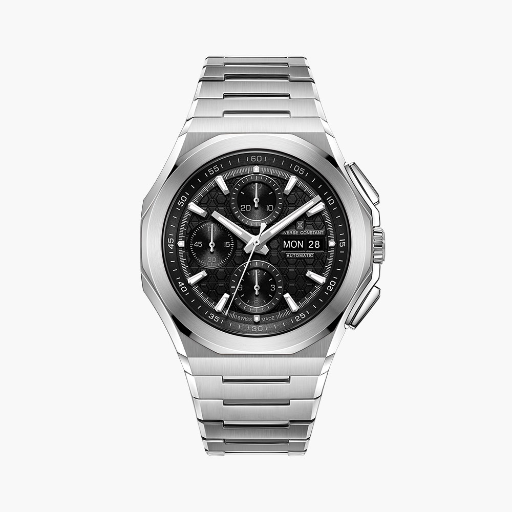 Stainless steel case, automatic movement, chronograph, day&date indicator, black dial, integrated bracelet, octagon patterned dial