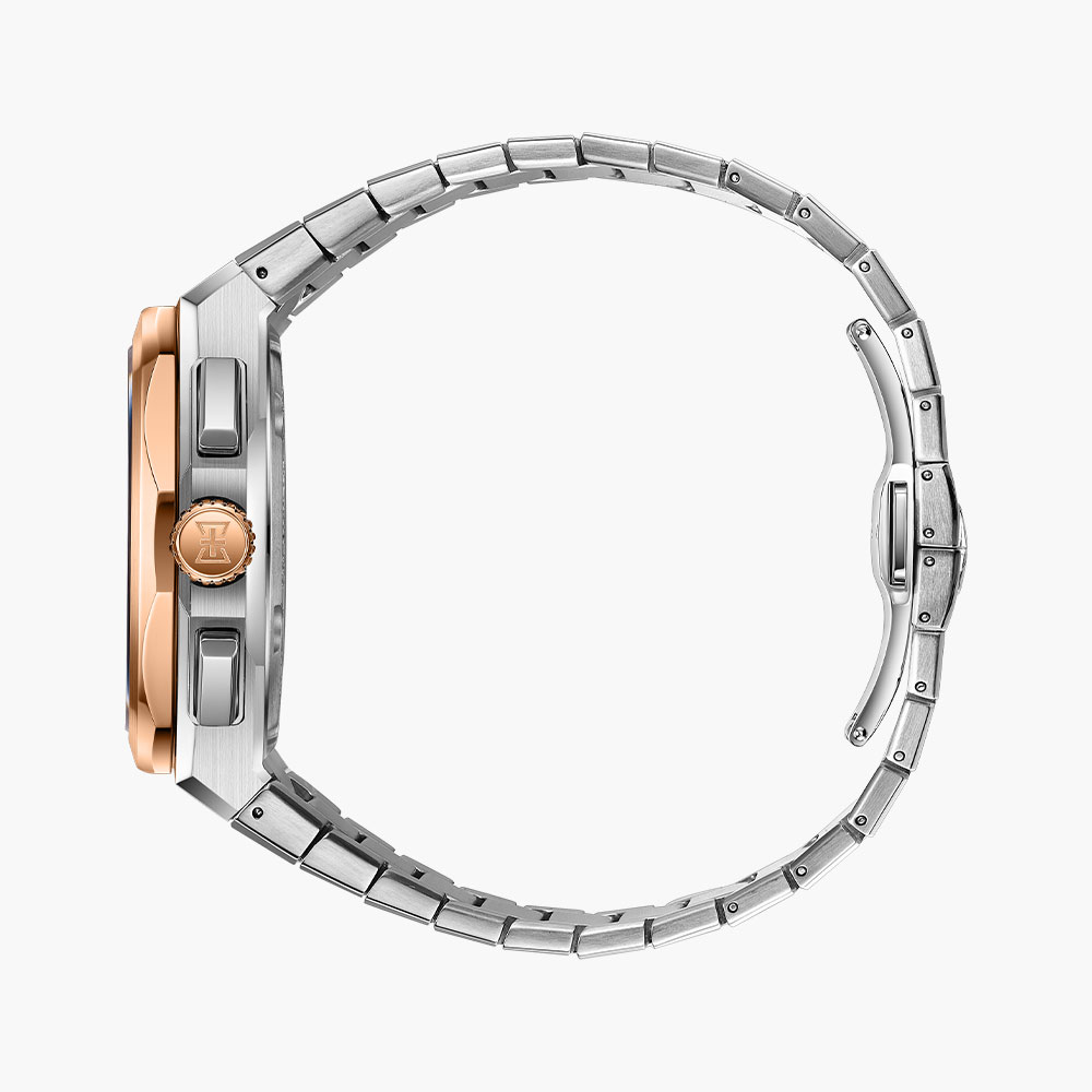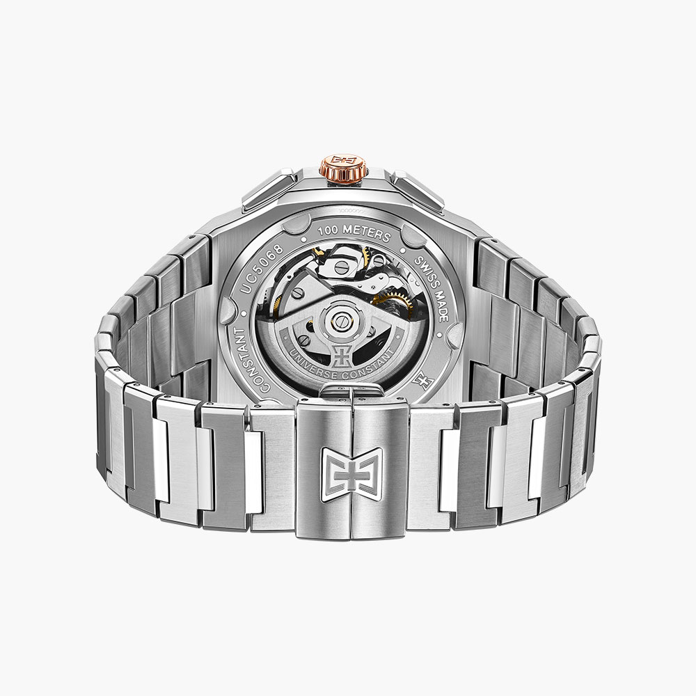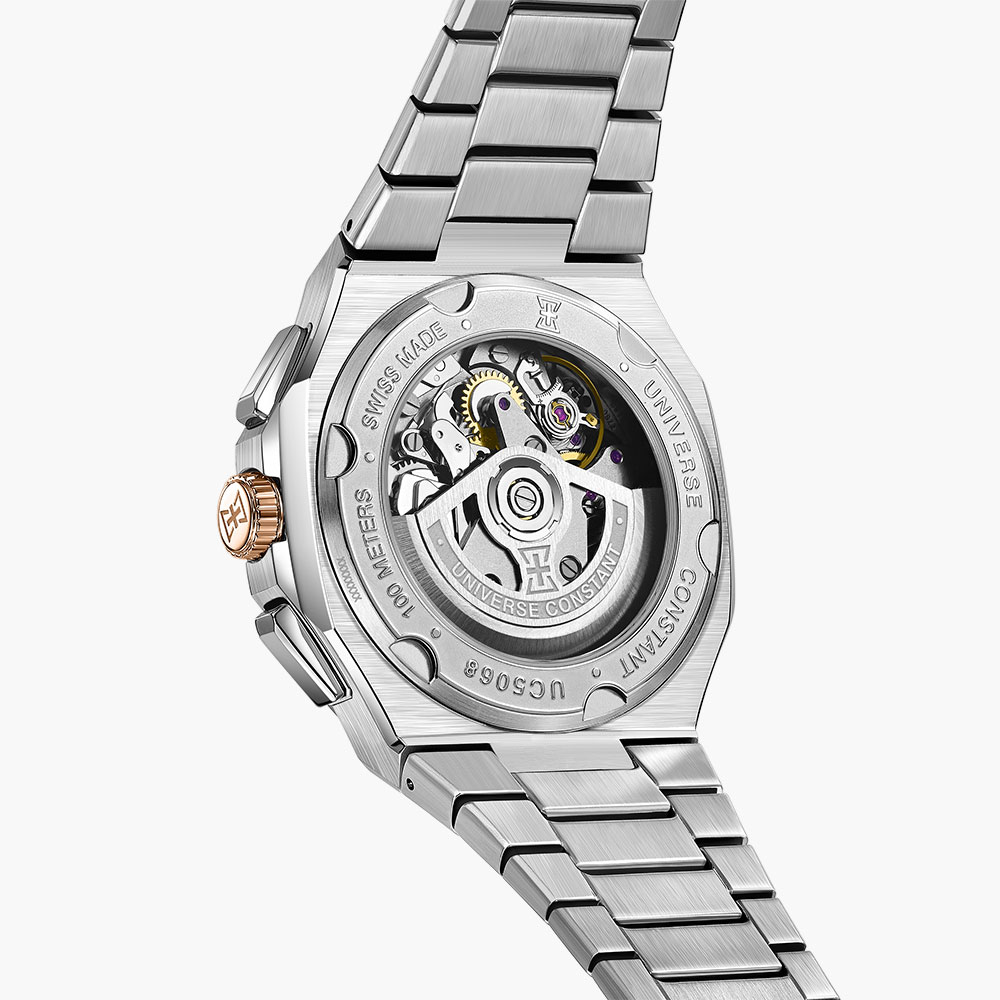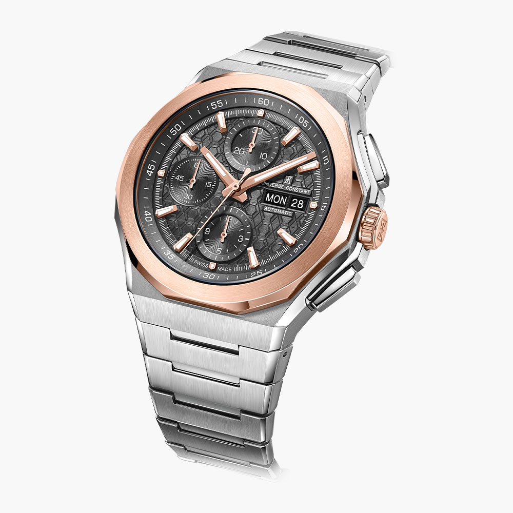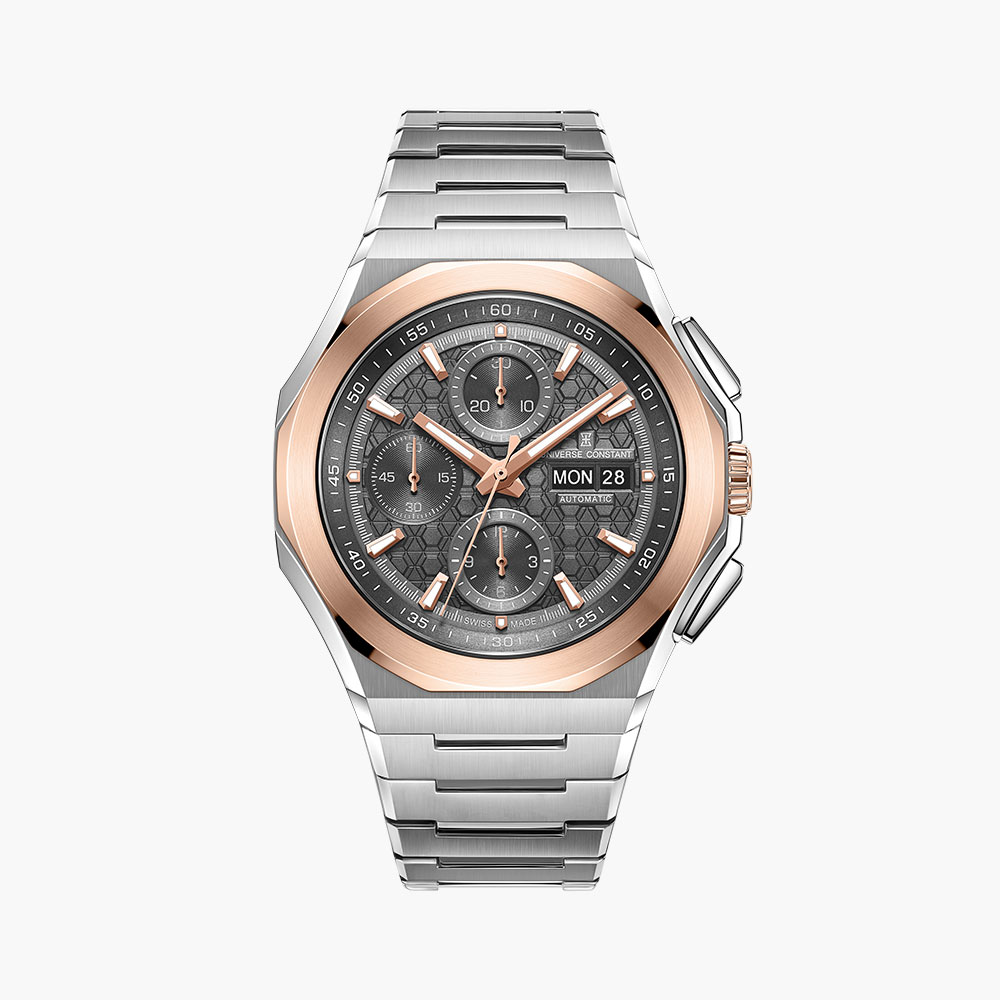 Stainless steel case, automatic movement, chronograph, day&date indicator, gun dial, integrated bracelet, octagon patterned dial