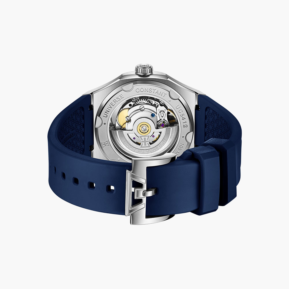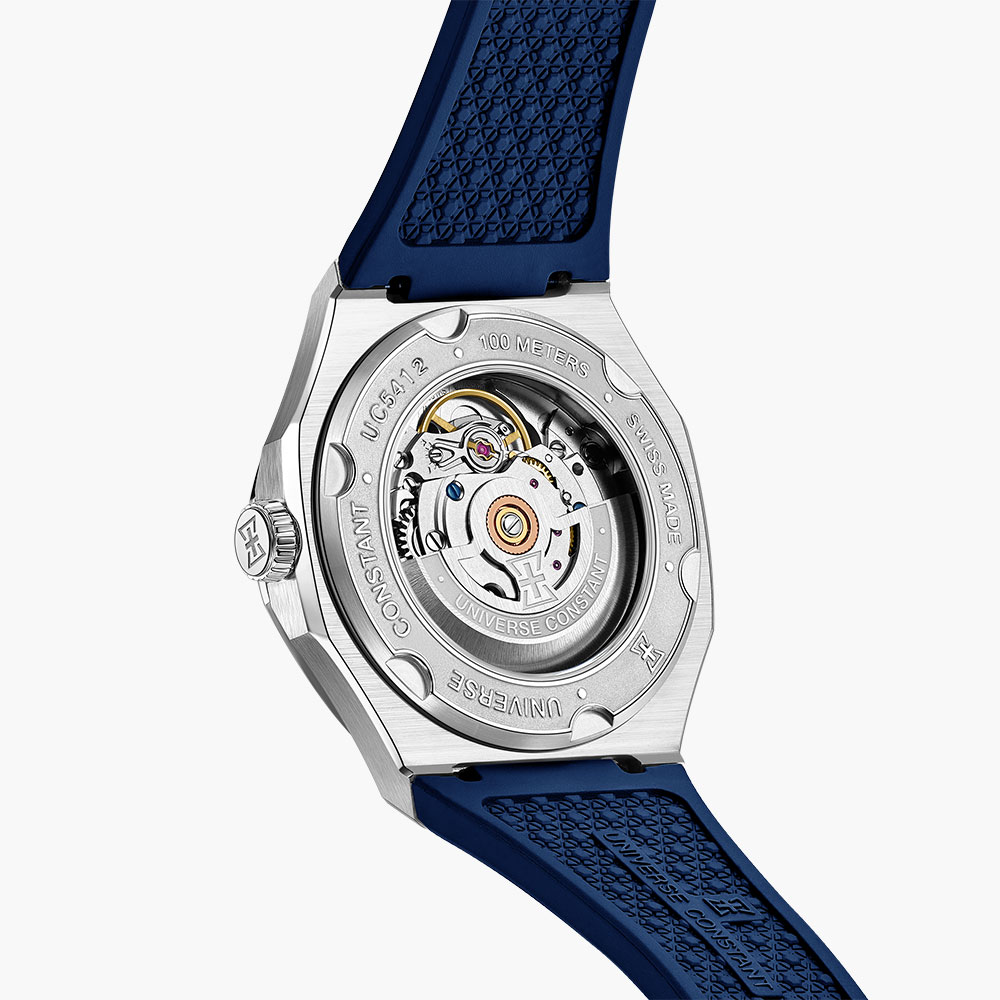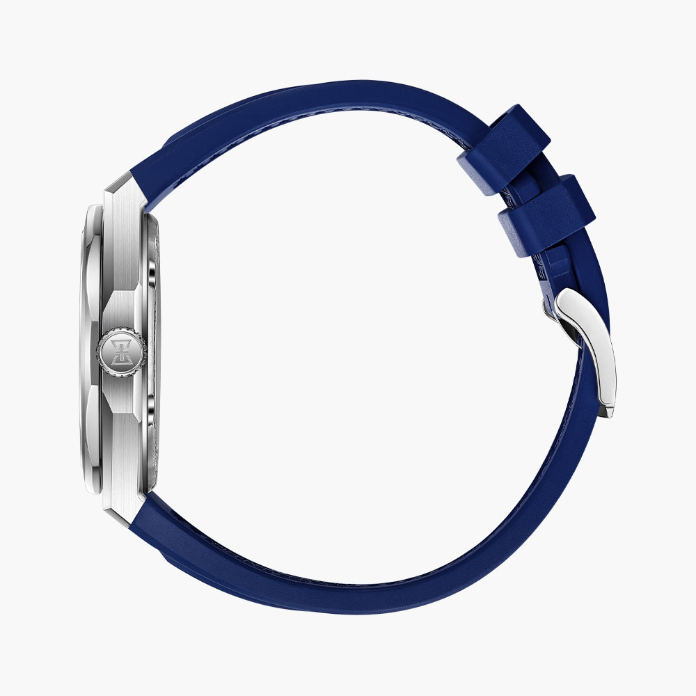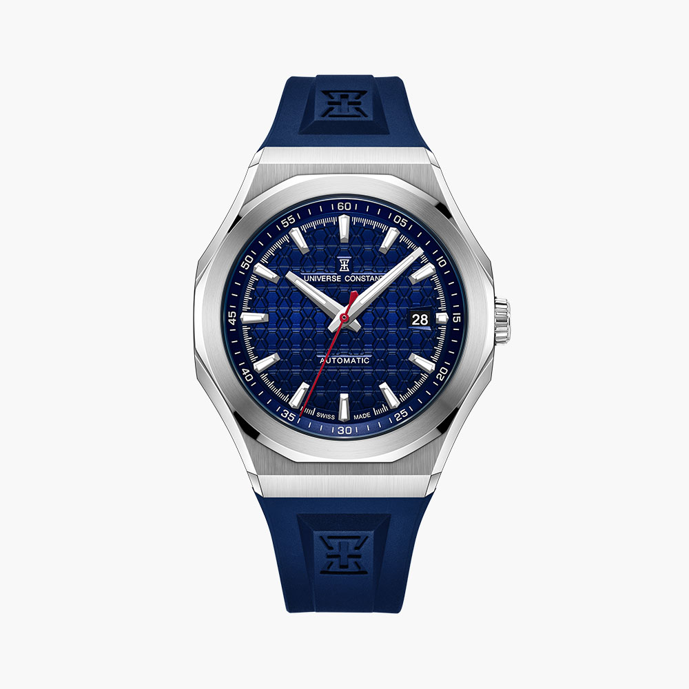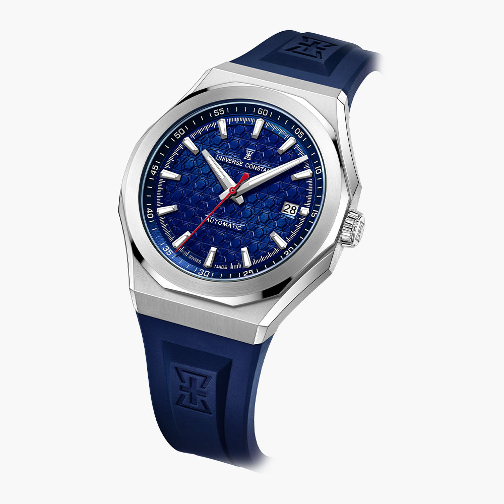 Stainless steel case, automatic movement, date indicator, blue dial, integrated bracelet