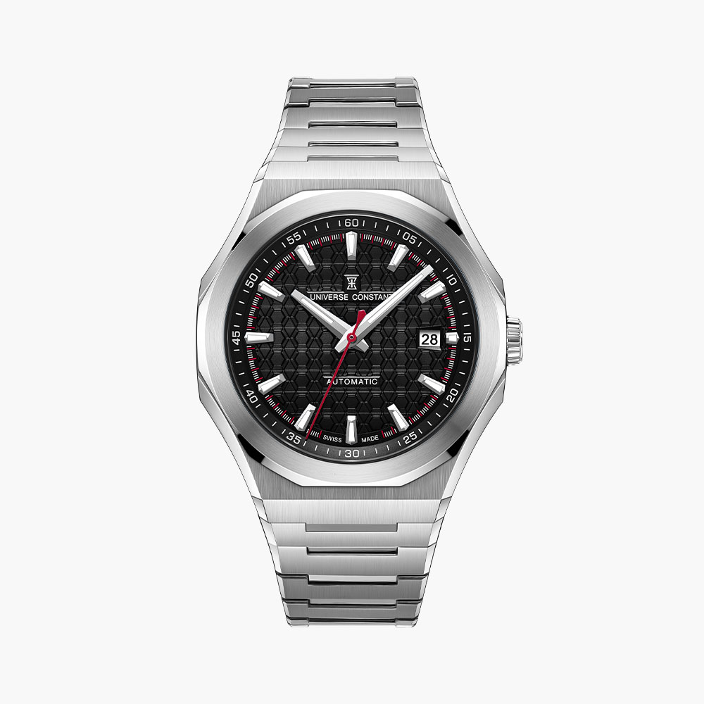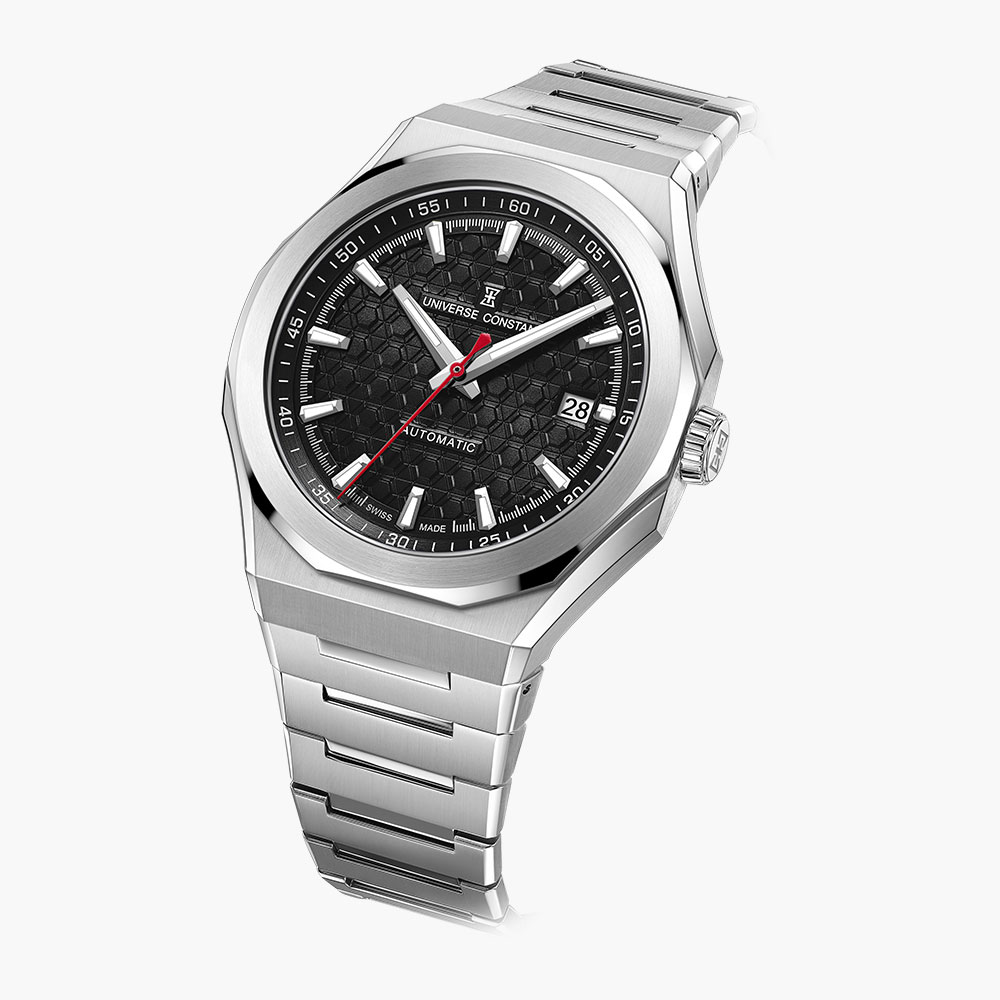 Stainless steel case, automatic movement, date indicator, black dial, integrated bracelet