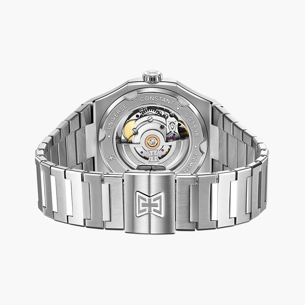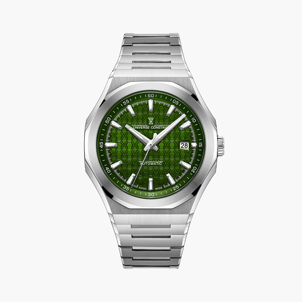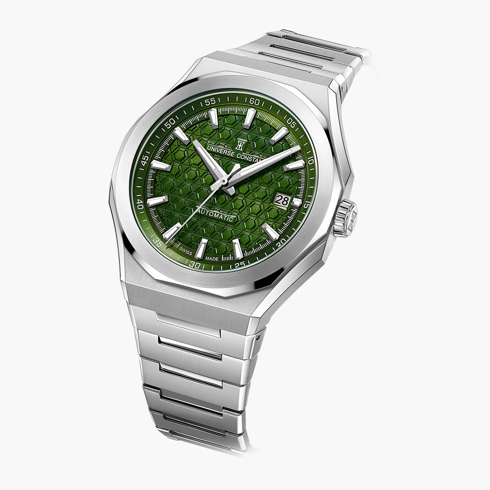 Stainless steel case, automatic movement, date indicator, green dial, integrated bracelet