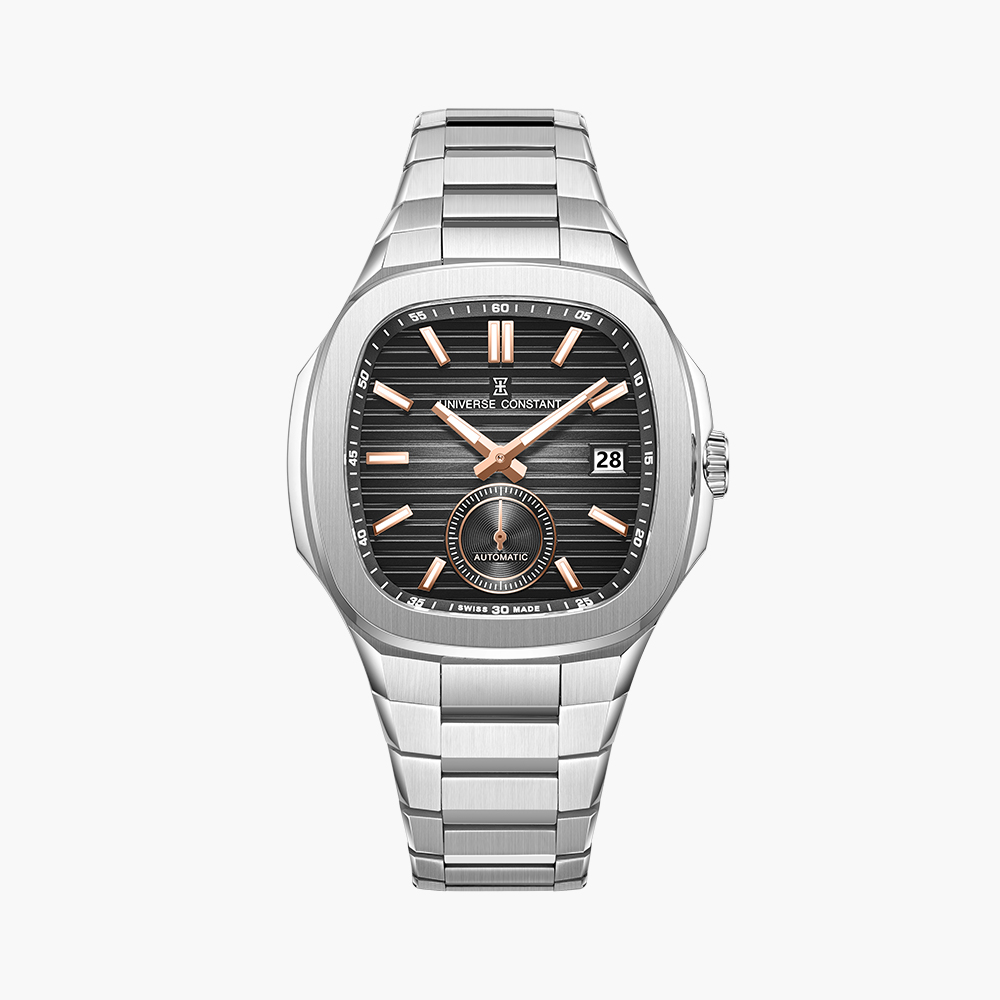 Stainless steel case, automatic movement, date indicator, small seconds, integrated stainless steel bracelet