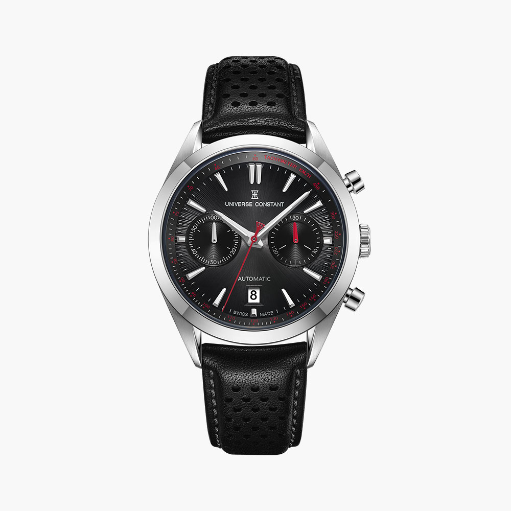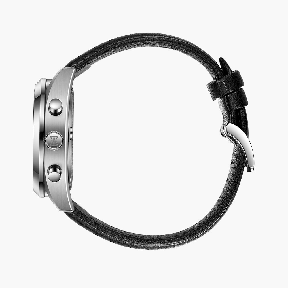 Stainless steel case, automatic movement, date indicator, black dial, calf leather strap