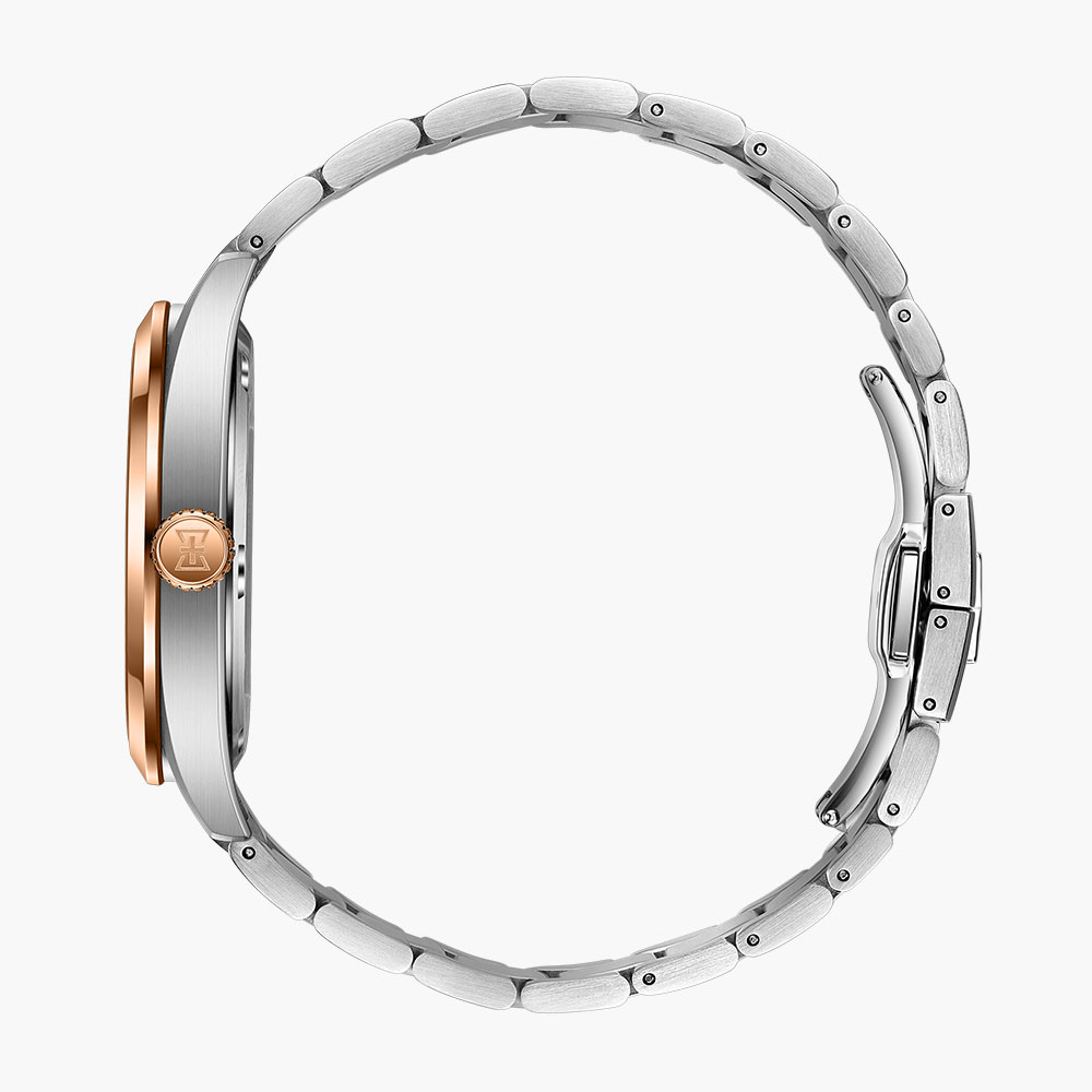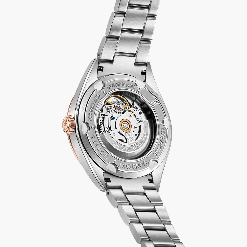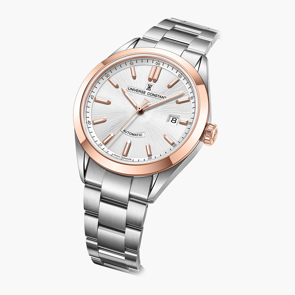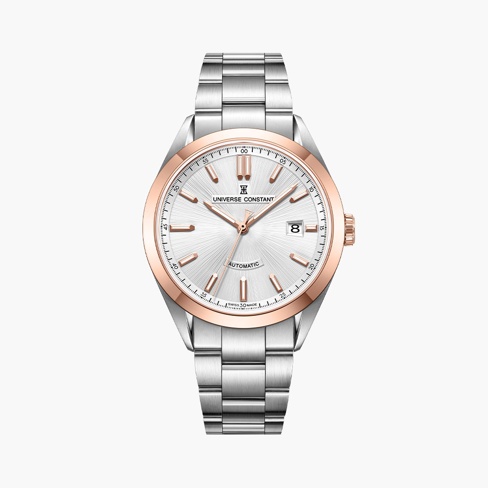 Stainless steel case, automatic movement, date indicator, silver dial, stainless steel bracelet