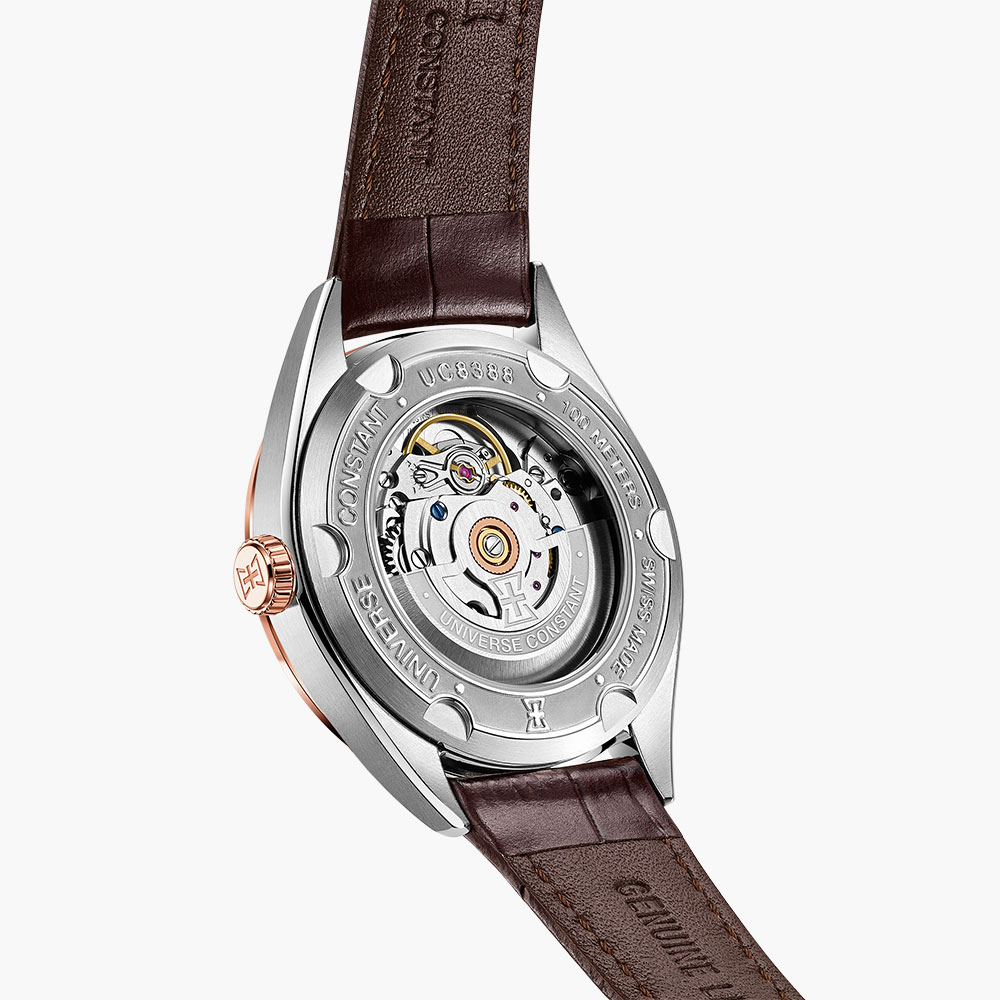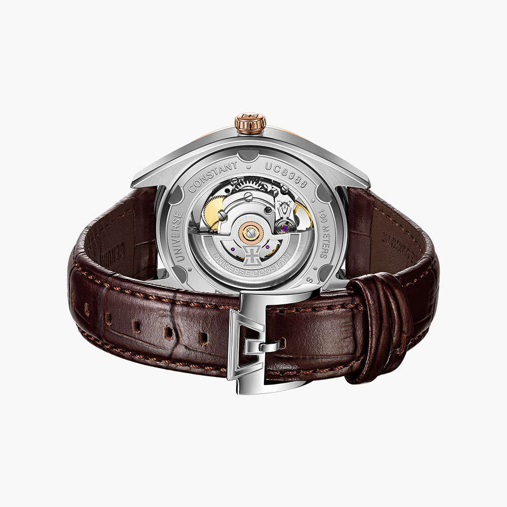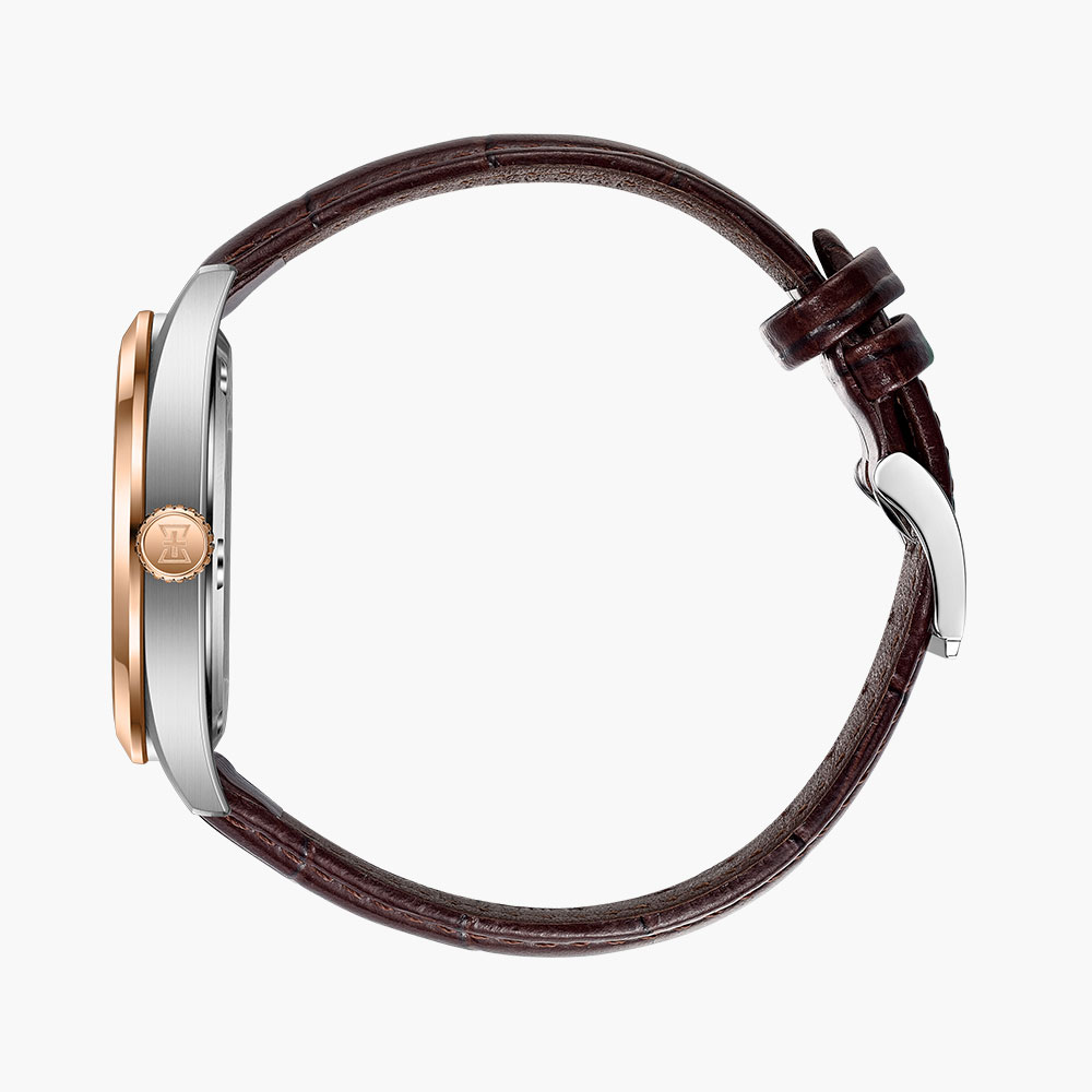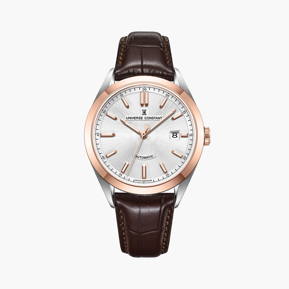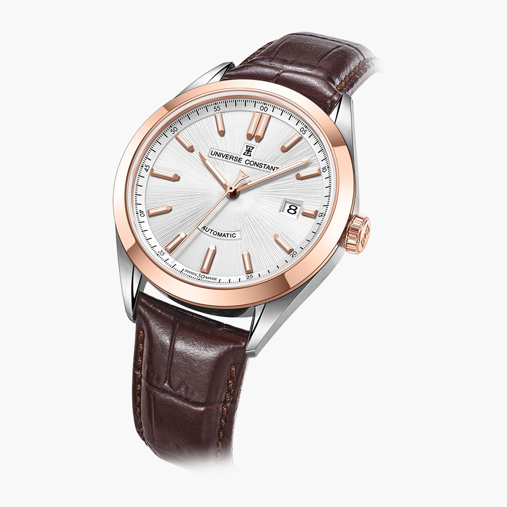 Stainless steel case, automatic movement, date indicator, silver dial, calf leather strap