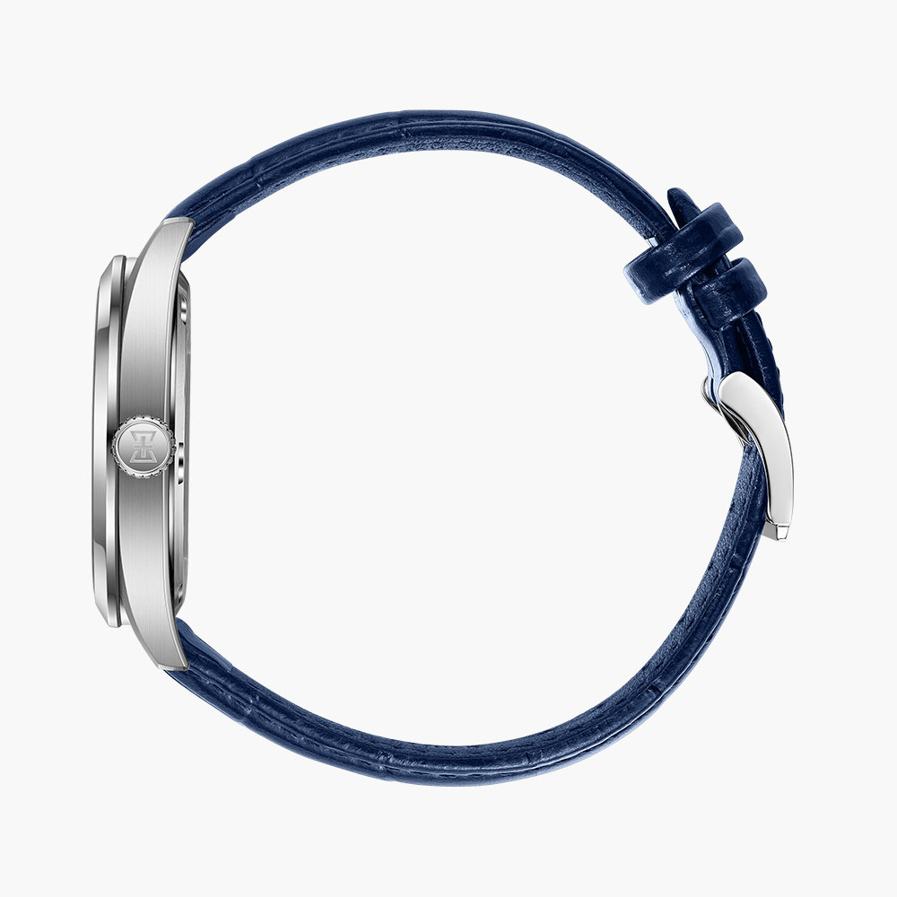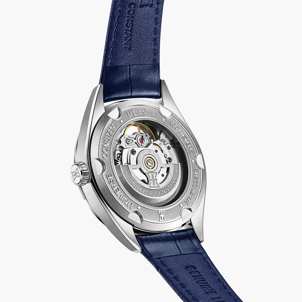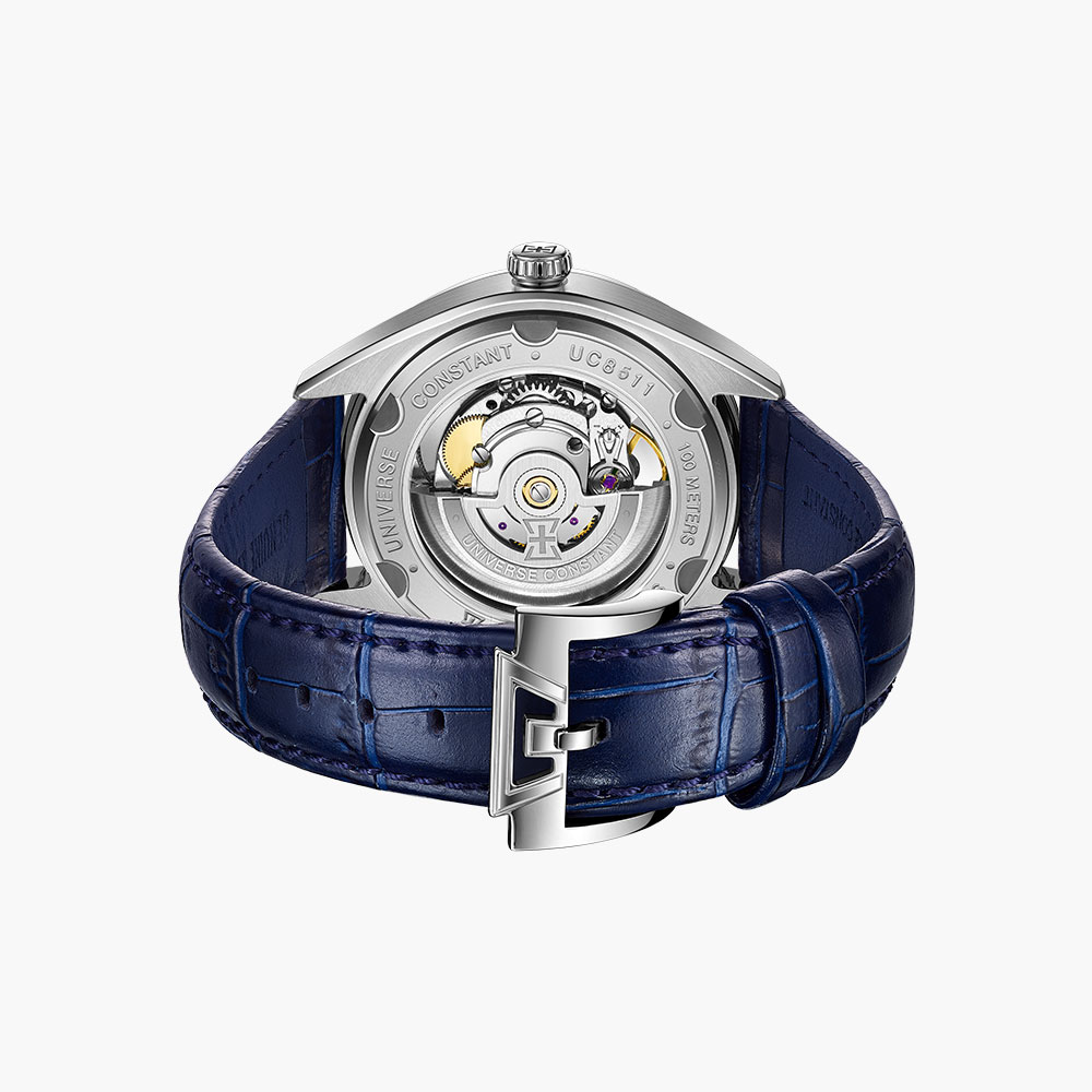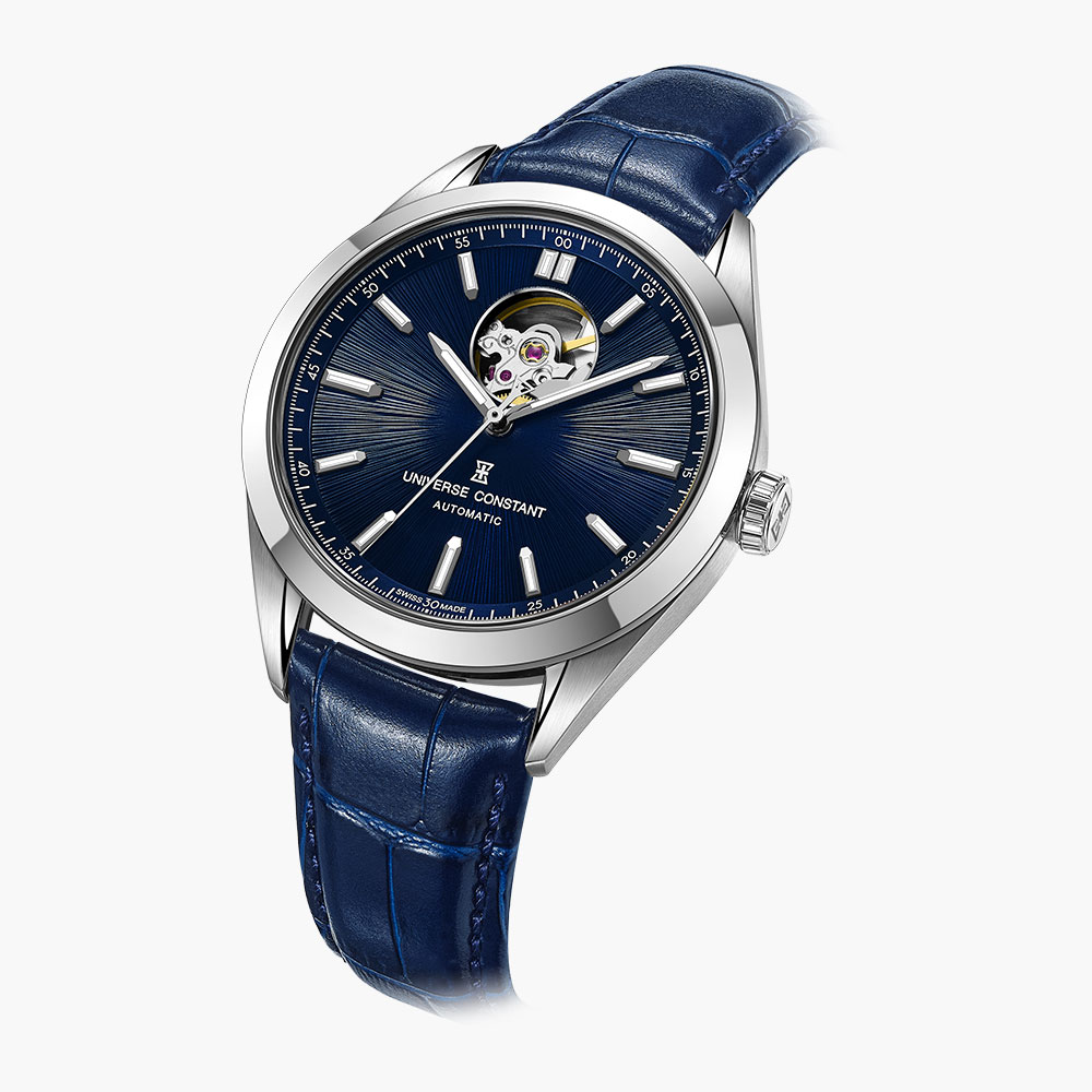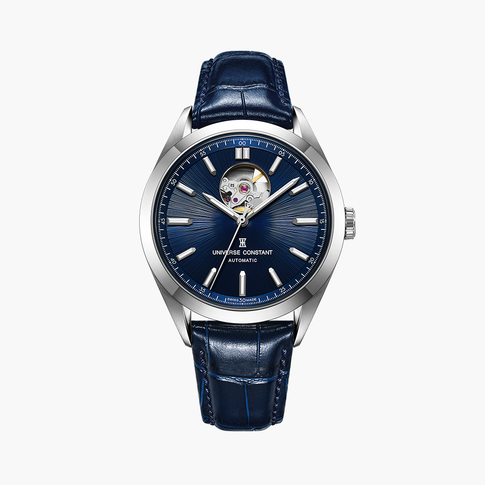 Stainless steel case, open heart automatic movement, blue dial, calf leather strap