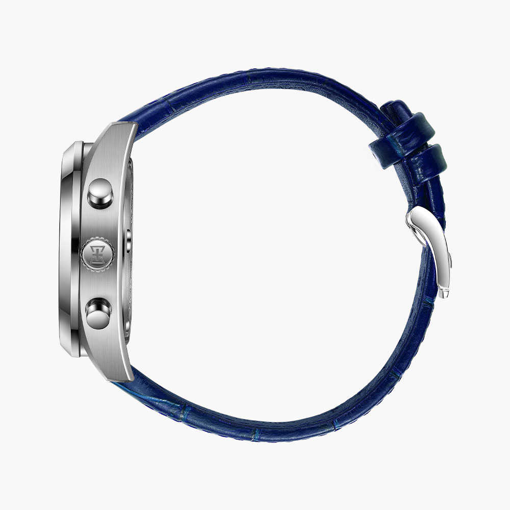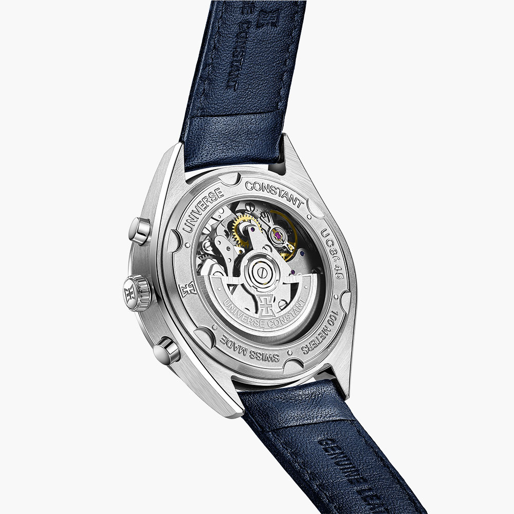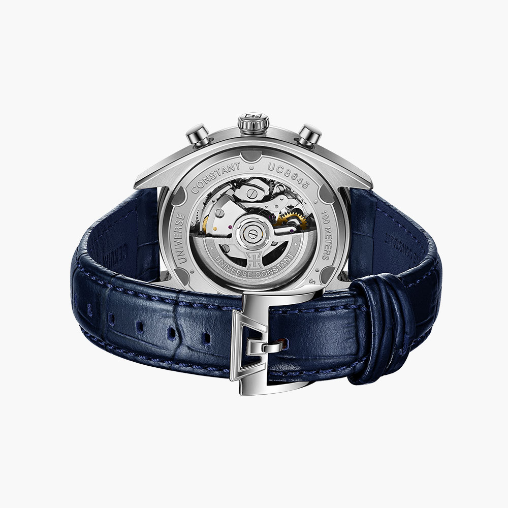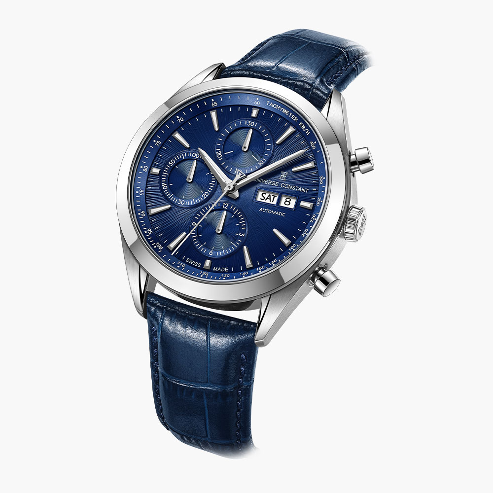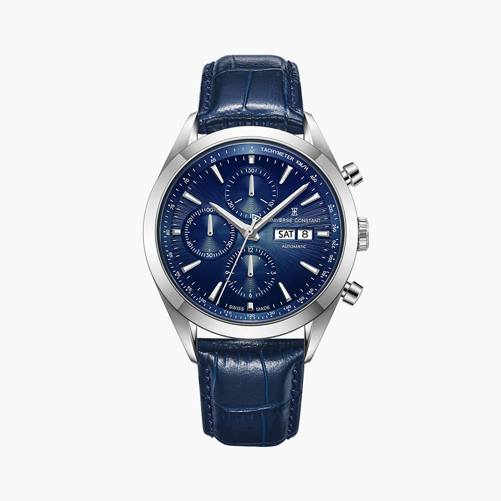 Stainless steel case, automatic movement, chronograph tri-compax, day&date indicator, calf leather strap